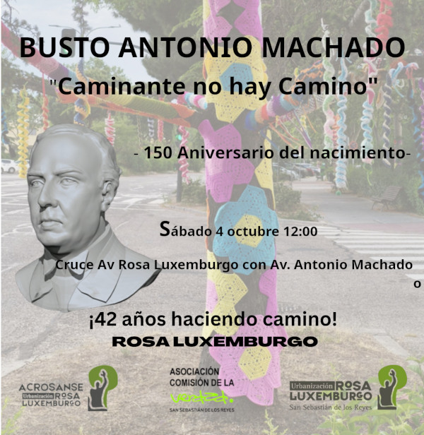 La Asociación Cultural Rosa Luxemburgo, la Comunidad de Propietarios y la Comisión de la Verdad han erigido, a propuesta de vecinos y vecinas del barrio, un monumento al gran poeta de la Generación del 98 que tiene una avenida en nuestro barrio en el 150º aniversario de su nacimiento.