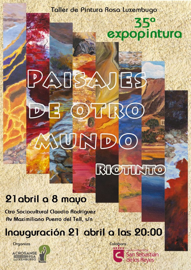 El próximo 21 de abril a las 20:00 horas tendrá lugar la inauguración de la exposición de fin de curso del taller de pintura de Rosa Luxemburgo, bajo el título “Paisajes de otros mundos: Riotinto”, organizada por la Asociación Acrosanse en el Centro Sociocultural Claudio Rodríguez.