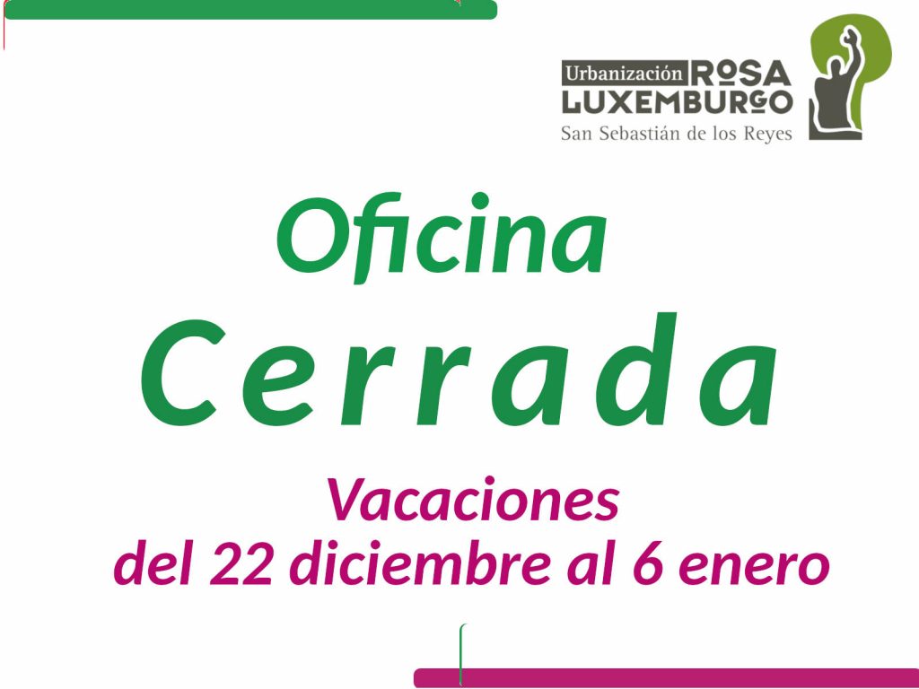 - Vacaciones Navidad 2025Estimad@s Vecin@: Desde la administración de la Comunidad os informamos que la oficina permanecerá cerrada por vacaciones desde el 22 de diciembre hasta el 6 de enero (ambos inclusive). Os …